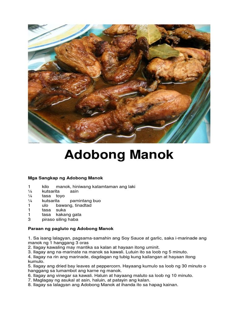 Ibuhos ang gata at sili. 1 kilong manok anumang parte ang naisin 6 na pirasong kalamansi. Chicken cut into serving pieces 3 pieces dried bay leaves 3 cloves garlic crushed 4 tbsp soy sauce 2 tbsp vinegar 14 cup cooking oil 12 tablespoon white sugar Salt and whole peppercorn 1 to 2 cups water Paraan ng pagluto ng Adobong Manok 1.